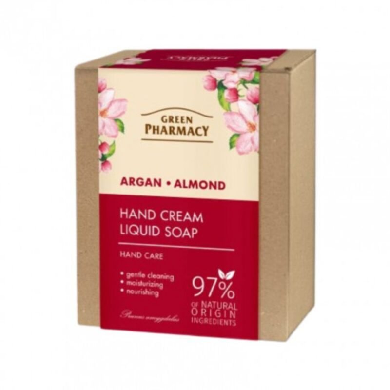 Nuostabus rankų priežiūros rinkinys. Skystas muilas praturtintas migdolų bei argano aliejais, skirtas kasdienei rankų švarai ir gaivai palaikyti. Efektyviai valo, maitina odą, neleidžia jai išsausėti, suteikia komforto pojūtį kas kartą plaunant rankas. Rankų kremas su argano aliejumi drėkina ir minkština odą, suteikia jai elastingumo, o taip pat apsaugo nagus nuo lūžinėjimo.